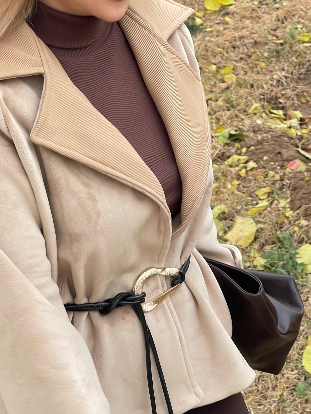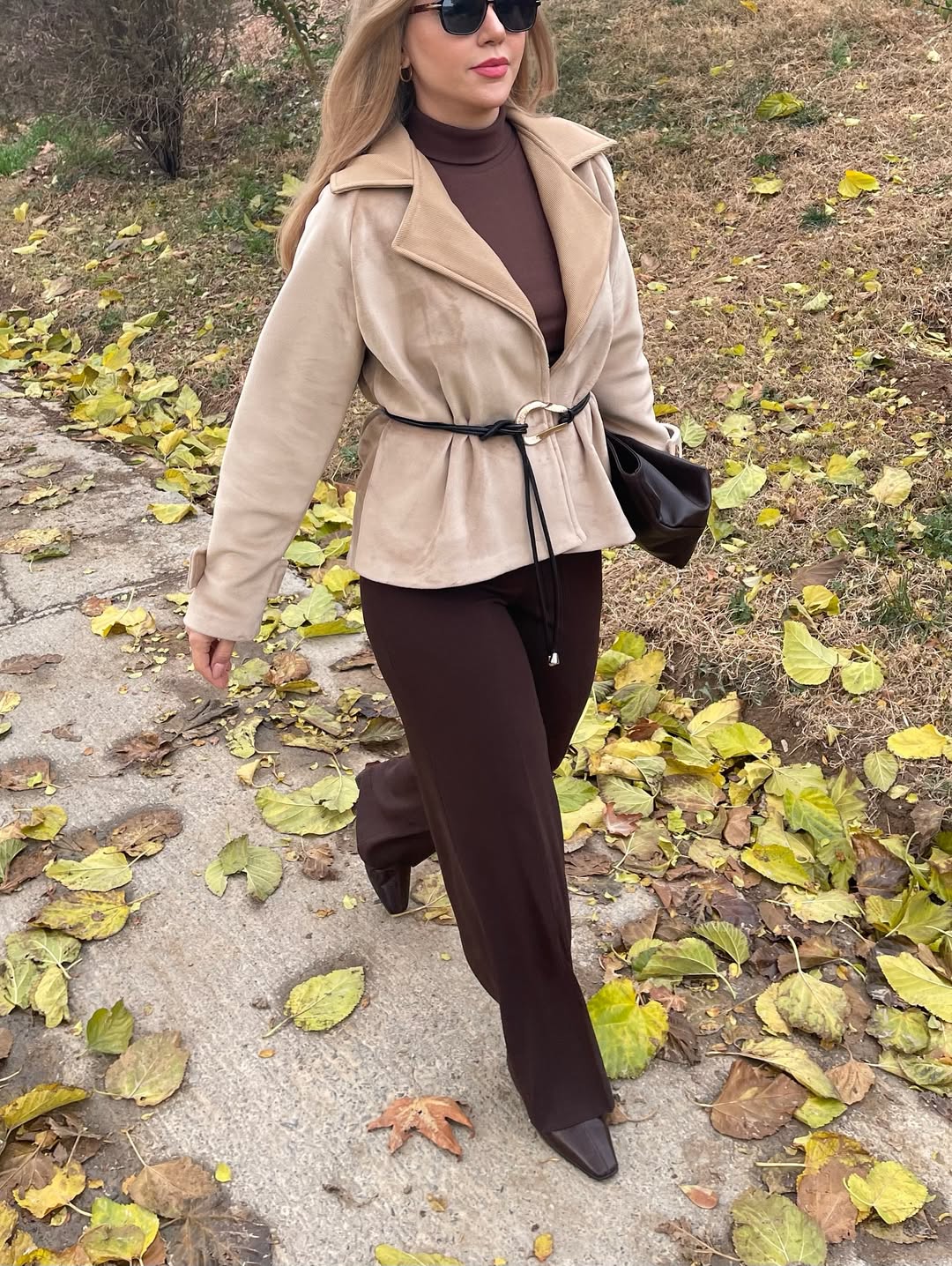کت مخمل دورو ترکیبی (مخمل خواب دار و مخمل کبریتی) همراه با کمربند. قد کت از ۶۰ تا ۷۰ قابل تغییر میباشد.